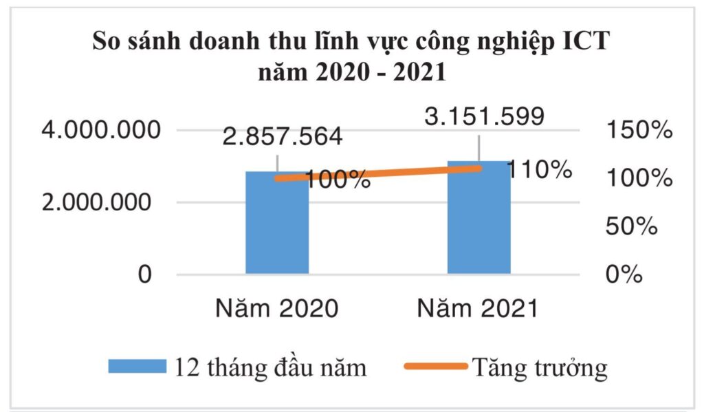 Theo số liệu Bộ TT&TT, doanh thu ngành công nghiệp ICT năm 2021 đạt 136.153 triệu USD, tăng trưởng so với con số trên 124.678 triệu USD năm 2020.