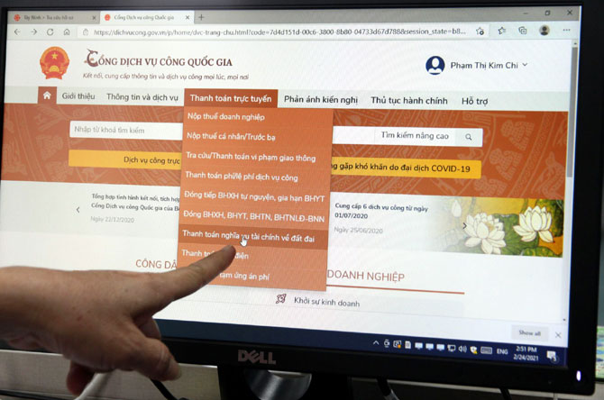 Theo báo cáo của Văn phòng UBND tỉnh, đến ngày 11/3/2021, toàn tỉnh có 1.251 giao dịch thanh toán trực tuyến nghĩa vụ tài chính các thủ tục hành chính về đất đai, với tổng số tiền trên 5,080 tỷ đồng, dẫn đầu các tỉnh thực hiện thí điểm dịch vụ này. Tại Văn phòng đăng ký đất đai 9 huyện, thành phố có 390 hồ sơ nộp nghĩa vụ tài chính trực tuyến, đạt 73,6% chỉ tiêu UBND tỉnh giao. Trong đó, có 2 huyện vượt chỉ tiêu giao là Tam Đảo và Bình Xuyên; tiếp đến là thành phố Vĩnh Yên và thành phố Phúc Yên; 3 huyện: Lập Thạch, Tam Dương và Yên Lạc đều chưa đạt 40% chỉ tiêu.